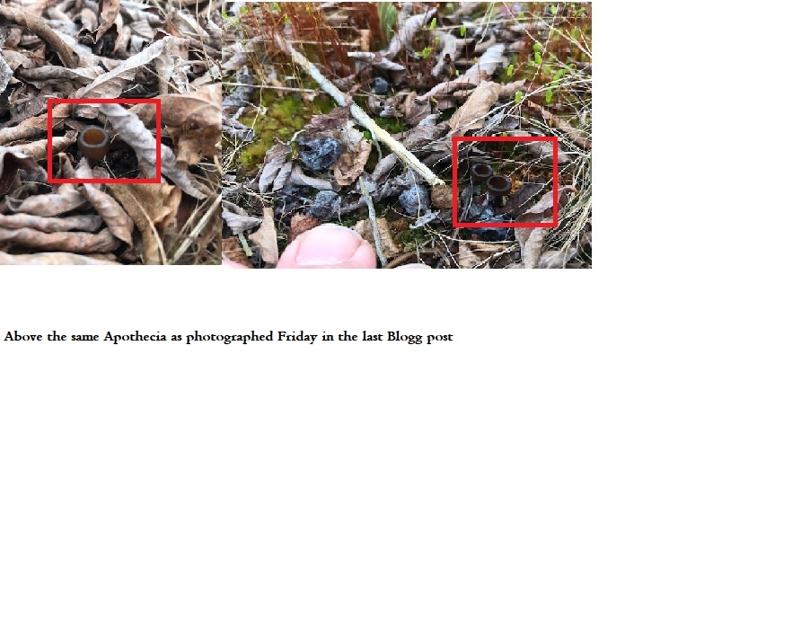 Out of concern I ran around this morning to my usual areas. The same apothecia that I took pictures of Friday